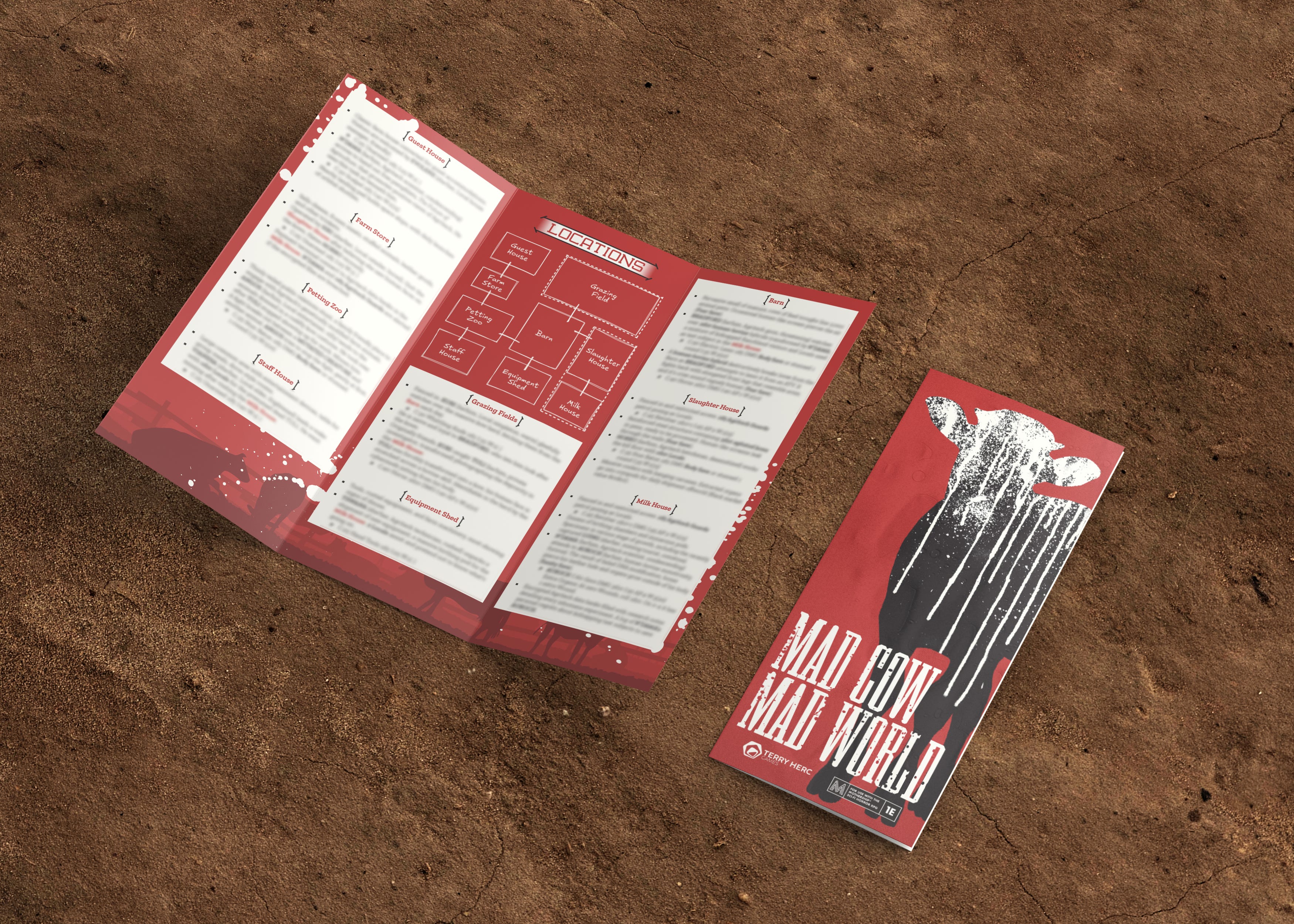 In the brief, Terry mentioned I should use colours that felt reminiscent of farms: red for barns, brown for mud, green for grass... I used a dark red to convey the sense of menace and picked a creamy white to create a soft contrast with the background. I applied this logic to all the other elements of the design: